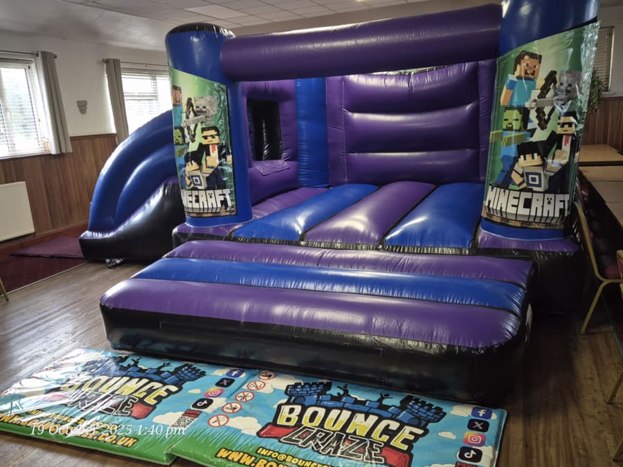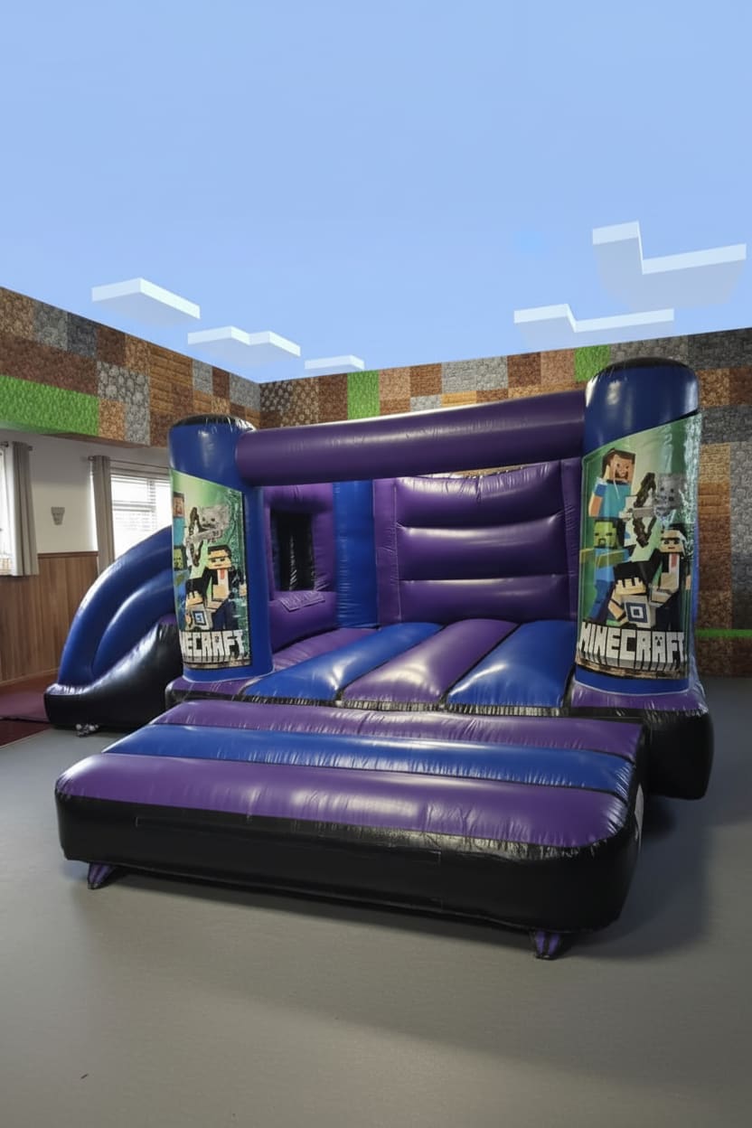 Use this Purple & Blue Castle with low slide (14ft by 18ft) - Minecraft Theme for themed birthday parties, school fun days, church events, and family reunions. The instant visual appeal boosts excitement and encourages active play. ๐